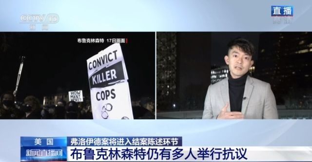 央视记者 刘骁骞: 赖特案的发生地点布鲁克林森特离弗洛伊德案的法庭很近,开车的话不超过半小时。昨天晚上我们一抵达当地就直接去了抗议现场。根据警方的评估,现场大概有几百人。虽然现场的抗议是和平的,但可以看见有些人佩戴防毒面具、头盔,因为在之前的几个夜晚都发生了警察投掷催泪瓦斯和防暴弹的情况。