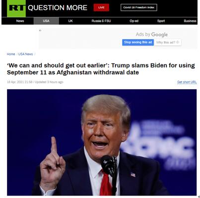 据“今日俄罗斯”(RT)报道,美国前总统特朗普18日发表声明抨击现总统拜登于今年9月11日前将驻阿富汗美军全部撤离的决定,称“我们可以并且应该更早撤离”。