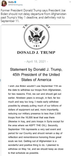特朗普说,他希望拜登不要将9月11日作为美军全部撤离阿富汗的截止日期,并表示“有两个原因”。