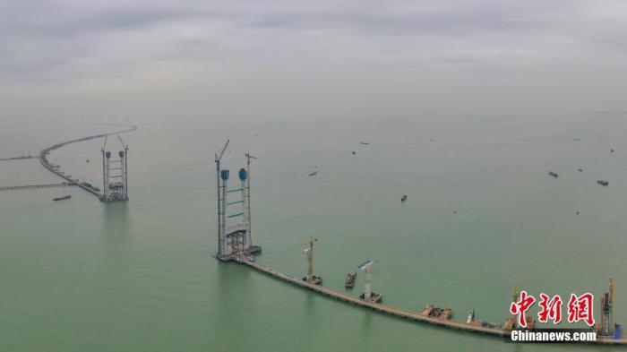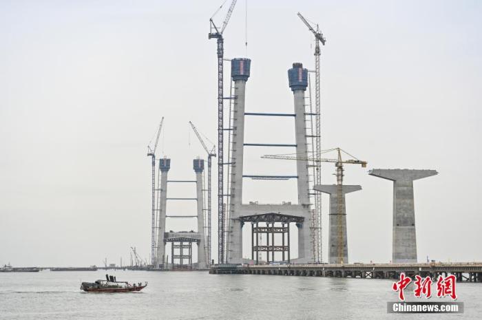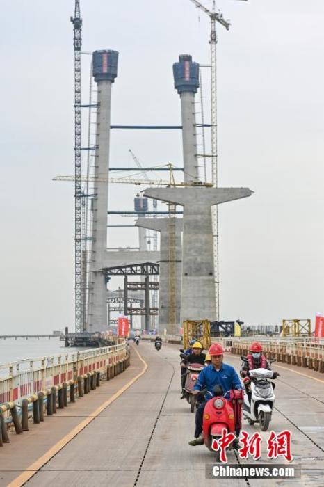 4月17日,广东省中山市,深中通道中山大桥施工现场。 中新社记者 陈骥旻 摄