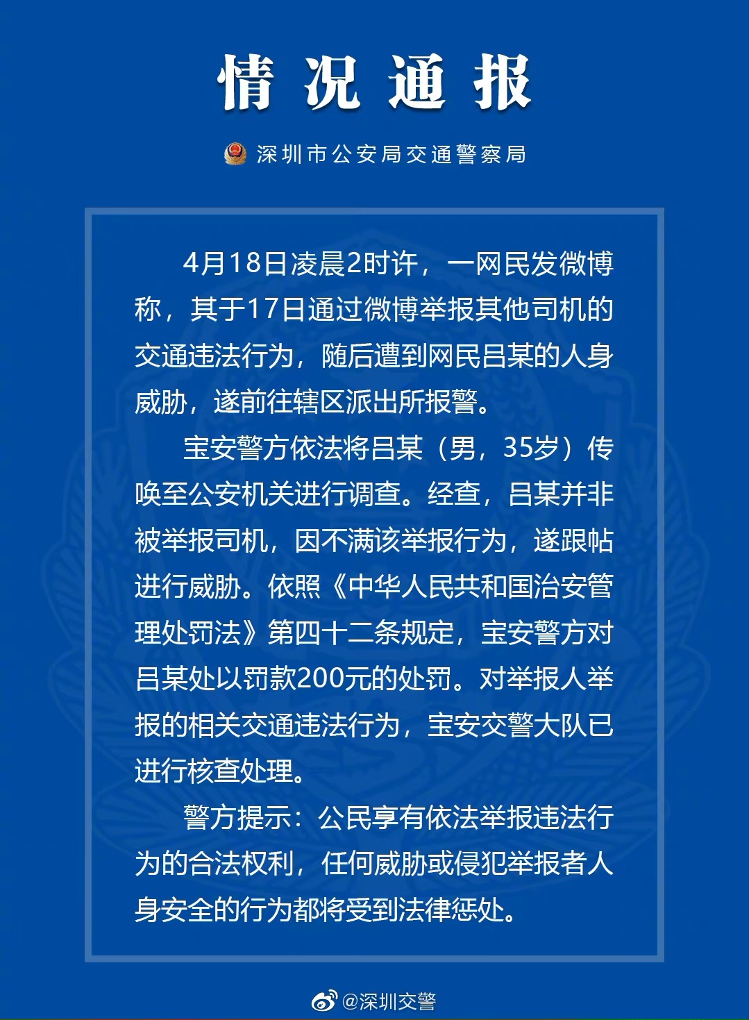4月18日凌晨2时许,一网民发微博称,其于17日通过微博举报其他司机的交通违法行为,随后遭到网民吕某的人身威胁。19日凌晨,深圳警方通报,威胁者吕某(男,35岁)并非被举报司机,因不满该举报行为,遂跟帖进行威胁。目前,警方已对吕某处以罚款200元的处罚。