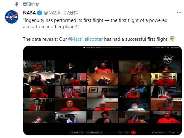 NASA在社交媒体“推特”上发布了这一消息,称“‘机智’号完成了它的第一次飞行——动力飞机在另一个星球上的第一次飞行。”