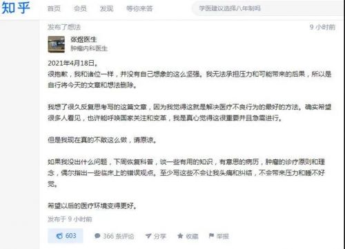 4月18日晚,张煜医生自称迫于压力和可能带来的后果,已将上述文章删除。