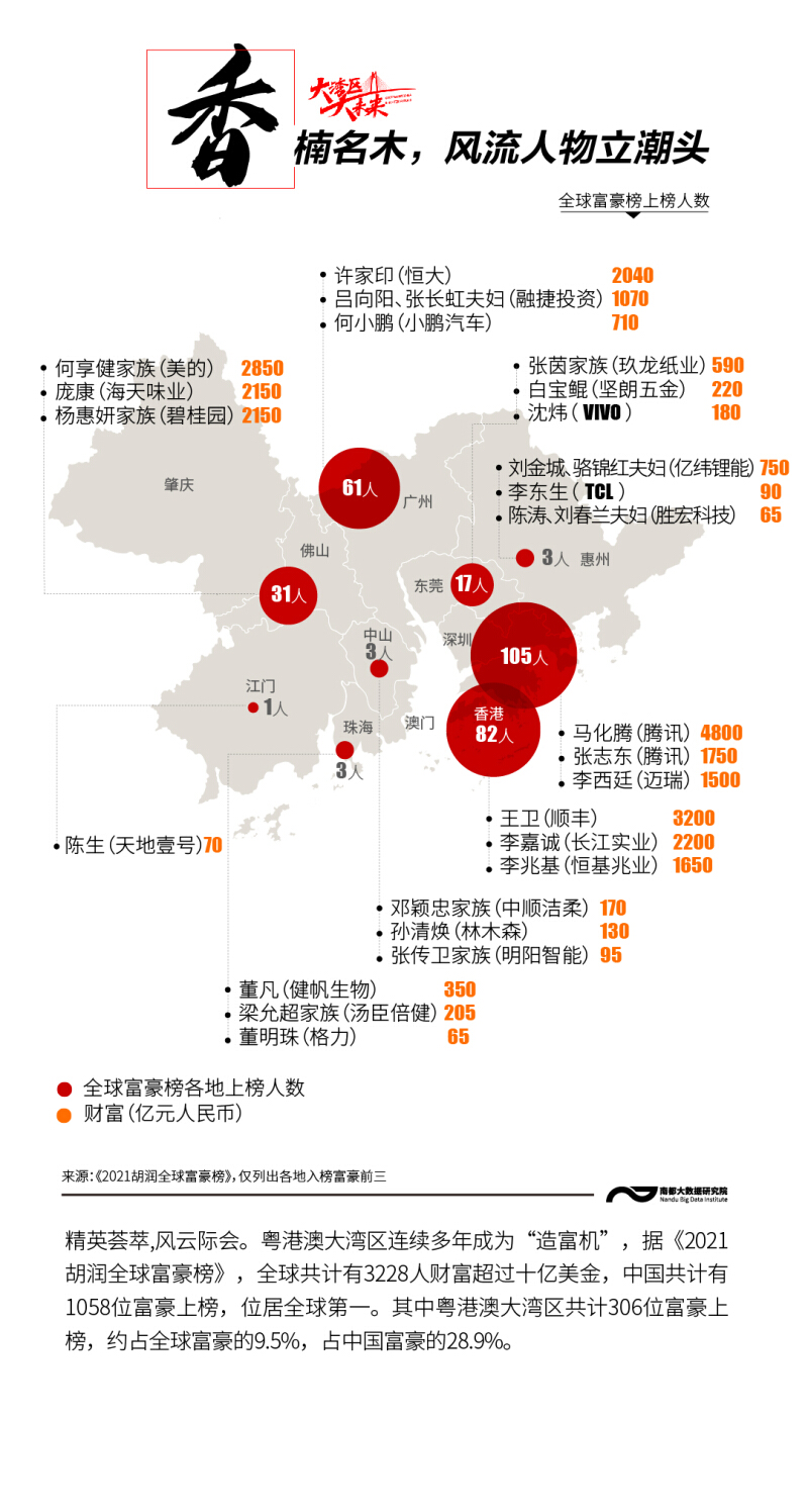 粤港澳大湾区,这个“充满活力的世界级城市群”,产业体系完备,经济互补性强,区域竞争力强大,拥有651家A股上市公司、108家中国500强民企、306位《2021胡润全球富豪榜》上榜富豪……南都大数据研究院梳理大湾区城市8组数据,多角度呈现粤港澳大湾区的“风华正茂”“活色生香”。