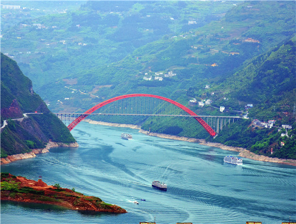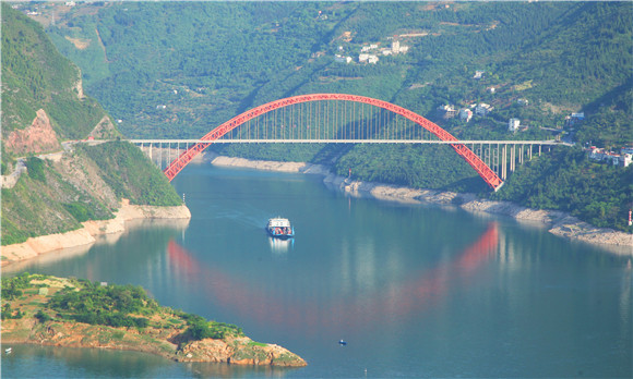 华龙网-新重庆客户端4月20日15是30分讯(通讯员 侯义高)近几天来,巫山时雨时晴,但雨过天晴后,巫峡两岸青山如洗,树木葱茏,青翠如滴;巫峡口风平浪静,江水碧波荡漾,宛如明镜,在阳光的照射下,巫山长江大桥的倒影摄入镜中,就像一只红色的大“眼睛”。山、水、桥、船、城,宛如一幅美丽的峡江山水画卷。