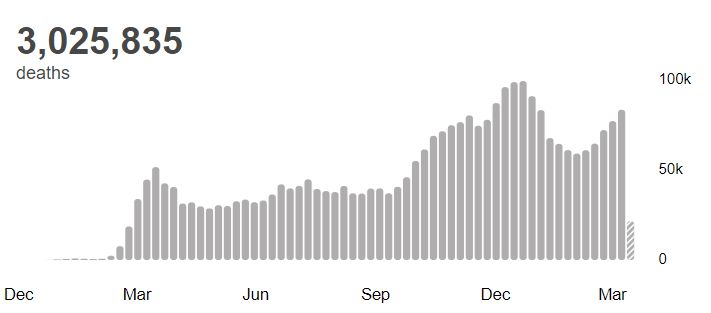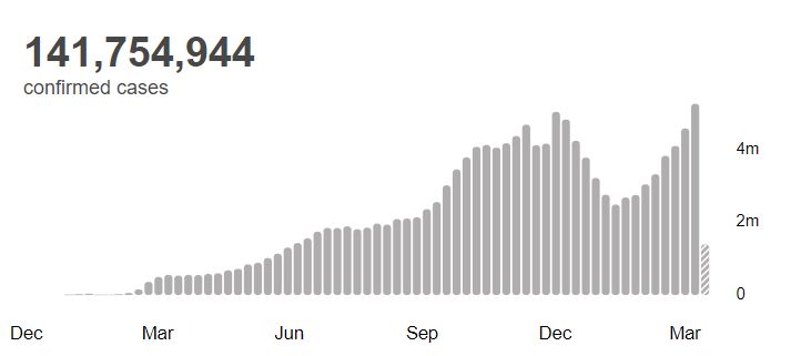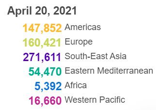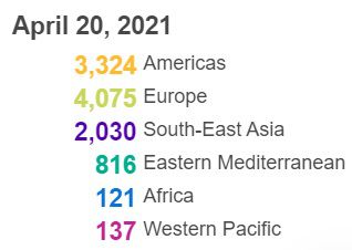 根据世卫组织最新实时统计数据,截至欧洲中部夏令时间4月20日15时57分(北京时间4月20日21时57分),全球累计新冠肺炎确诊病例141754944例,累计死亡病例3025835例。20日全球新冠肺炎确诊病例新增656406例,死亡病例新增10503例。