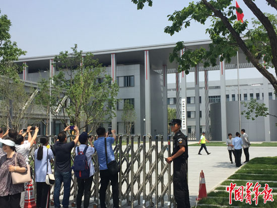 2018年6月12日,游客在雄安新区管委会门前拍照。 李新玲/摄