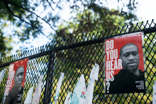 这是2020年6月19日在美国首都华盛顿白宫附近拍摄的印有非洲裔男子乔治·弗洛伊德头像的海报。(新华社记者刘杰摄)