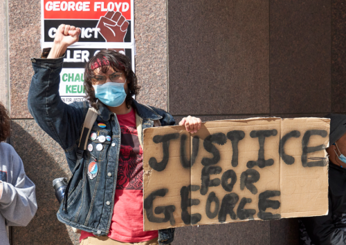 3月9日,在美国明尼苏达州亨内平县负责审理弗洛伊德案的法院周围,示威者手举“给弗洛伊德以正义”的标语牌参加抗议活动。(新华社发,马修·麦金托什摄)