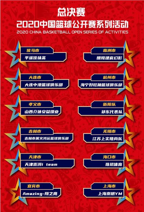 中国篮协于2019年推出中国篮球公开赛这一群众性篮球赛事平台。2020中国篮球公开赛系列活动于去年11月正式打响,在全国27个省(市、区)的46个城市进行。最终共16支城市代表队脱颖而出,获得了角逐总决赛冠军的资格,其中12支队伍参加此番在海宁进行的最终决战。