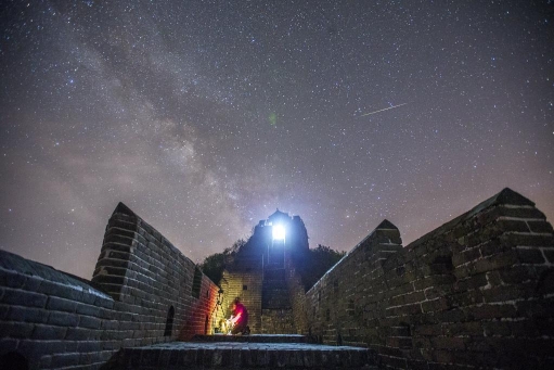北京市天文爱好者王俊峰2017年4月23日在河北承德金山岭长城拍摄的天琴座流星雨照片。(王俊峰供图)