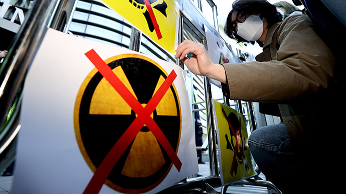 当地时间2021年4月14日,韩国首尔,在日本驻韩国大使馆前,大学生气候行动相关人士举行集会,抗议日本政府将核废水排入大海的决定。人民视觉 资料图