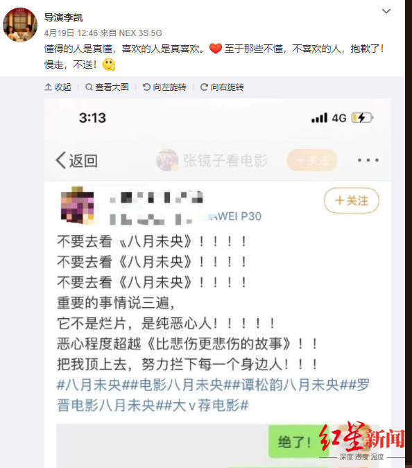 4月19日,《八月未央》导演李凯在微博晒出网友的差评,他不为所动地表示:不喜欢的慢走不送。