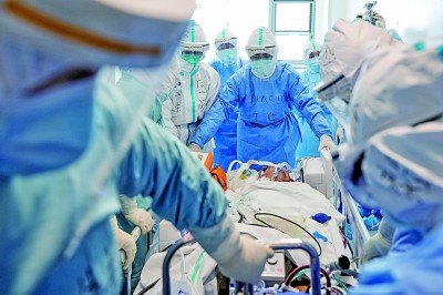 2020年4月12日,医务人员共同将一名新冠肺炎危重症患者转往武汉同济医院中法新城院区ICU。在转运过程中,ECMO(人工膜肺)治疗仍在持续进行。新华社发