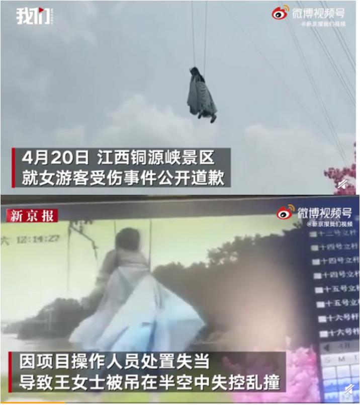 4月17日,江西南昌,王女士在铜源峡景区玩“铜源飞仙”网红项目时发生意外。监控显示,王女士最初吊着威亚悬在半空中,随后突然发生剧烈摆动,撞击到旁边设备上。王女士表示,其额头和腿部被撞伤,其中头部缝了将近40针,面临毁容风险。景区称,王女士和朋友牵手导致威亚顶部的钢丝缠绕。20日,景区一工作人员回应称,双方已达成口头谅解,景区将承担所有医疗费用以及后期误工、营养、精神损失费等相关费用。目前,该项目已被封停。
