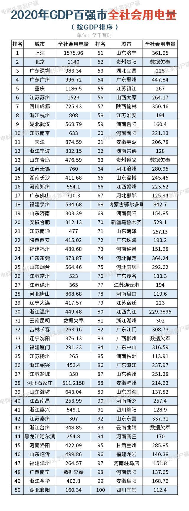 在2020年全国城市用电量榜单中,上海、苏州、重庆、北京分别以1575.96、1523、1186.5、1140亿千瓦时用电量居GDP百强城市前四位。