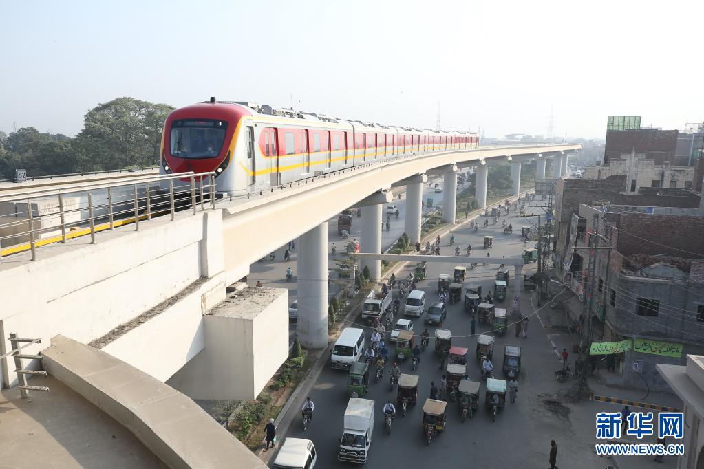 在巴基斯坦拉合尔市,一辆橙线地铁列车准备进站(2020年10月26日摄)。当日,巴基斯坦首条地铁——拉合尔橙线迎来首批乘客,标志着巴基斯坦步入“地铁时代”。新华社记者刘天摄