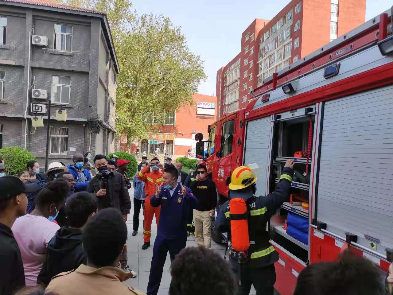 宣传员用英语、葡萄牙语、西班牙语讲述了消防基本常识、灭火器操作、消除宿舍火灾隐患、火场如何逃生等理论知识,并在室外空旷区域,对全体参训人员开展灭火器“灭真火”的实操实训。