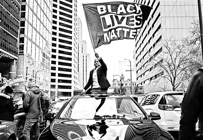 得知肖万被控的谋杀和过失杀人等三项罪名全部成立后,民众手举“黑人的命也是命”标语的旗帜聚集在法庭附近 供图/新华社
