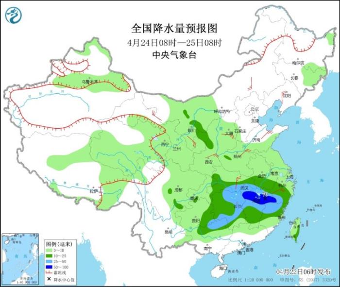 图3 全国降水量预报图(4月24日08时-25日08时)