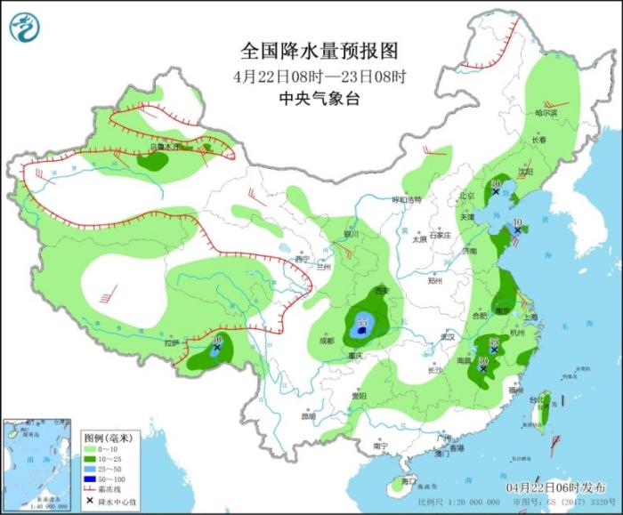 图1 全国降水量预报图(4月22日08时-23日08时)