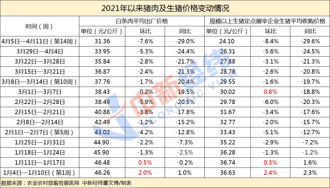 今年以来猪价到底降了多少?据农业农村部公布的监测数据,截至2021年第14周(4月5日-4月11日),全国白条肉(下称“猪肉”)平均出厂价格为31.36元/公斤,环比、同比已连续12周下降,从年初的46.26元/公斤跌至31.36元/公斤。