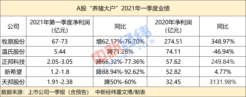 今年一季度,除牧原股份净利润逆市预增超六成外,其余则业绩集体“炸雷”。
