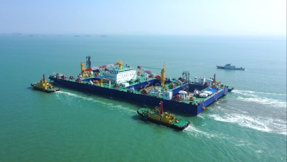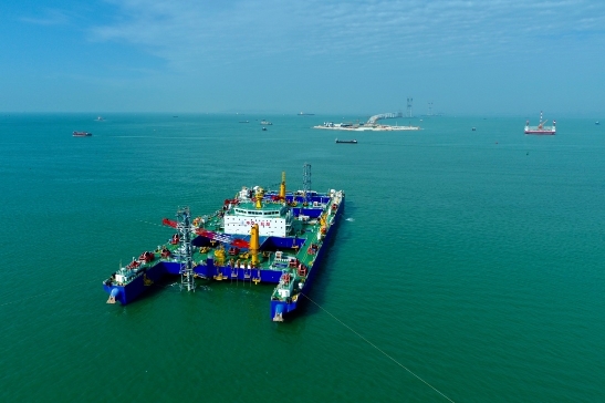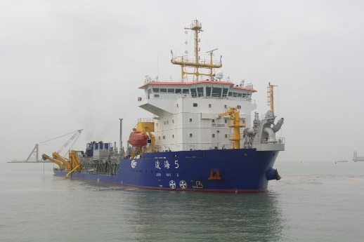 “浚海5”轮对E9管节施工海域进行清淤作业。