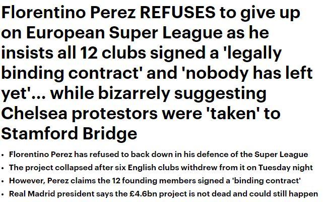 于是,在宣布成立欧超联赛时无比拉风的豪门们陆续退出,有些在声明里没明说退出,也点明了欧超联赛目前不可能实现。欧超联赛在成立了不到两天的时间里土崩瓦解。