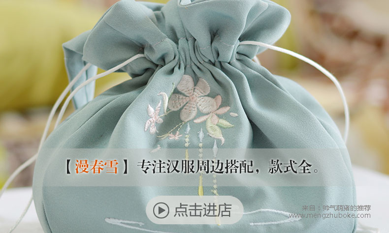 漫春雪:一家专注汉服搭配的店,包包和发带做较为优秀。入了她家那个豆绿公的款,颜色超级好看,绣花也很精美。整体就是一个非常貌美的袋子,很合我的心意,用来配汉服的大小刚刚好,手机、零钱、小本子都可以装进去,再也不用愁汉服出行手机没有地方装了。另外他家的其它款也不错,要不是我最近穷了我都想全要。