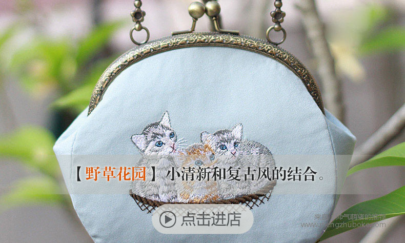 猫小姐原创女包:相当原创的一家,有一大波适合拿来搭配汉服的包,大多是小清新和复古风的结合体,版型也相当丰富的,斜跨包、手提包和手袋都有。入过她家一个绣花的斜挎包,刺绣的地方蛮好看的,做工超乎意料,五金件也是质感满满的感觉,这个价钱很值得入。