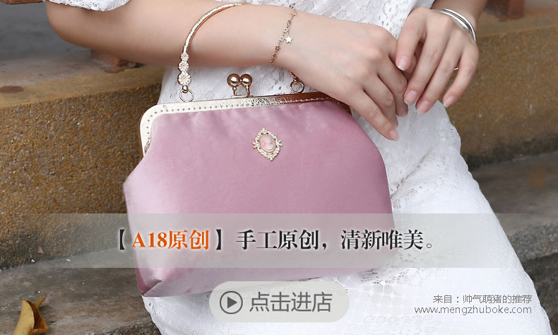 A18原创手工包:个人挺爱的一个手工原创包包铺,款不多,其中有几个特别适合拿来配汉服。复古又有小清新风格,花鸟的刺绣很唯美,还有米色、粉色和黑色这些色调可选,搭配汉服超好看。