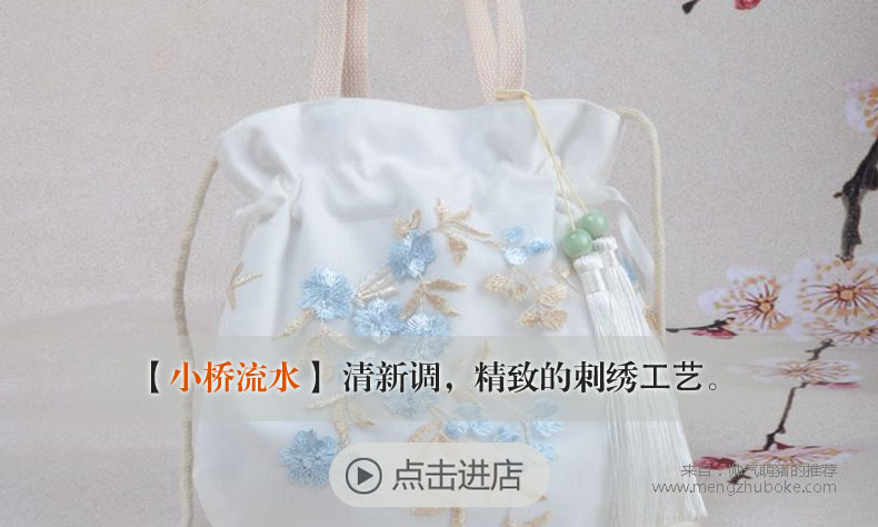 小桥流水:喜欢小清新包包的朋友就看这里了,也是一家关注好才时间的店,喜欢她家的清新调,每一款都超级精致,刺绣也很漂亮,布料设计搭配的都超级好。而且卖的不贵,很多款式都是可以接受的价位,性价比很高的。