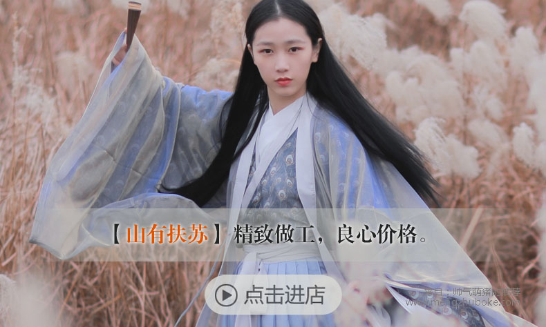 山有扶苏:一个标准的正版的汉服原创强店,价位在四百左右。她家的九歌是很出名的一件魏晋风了,估计很多刚入坑的都被它的美貌迷过。我也入了,自然也是相当满意。