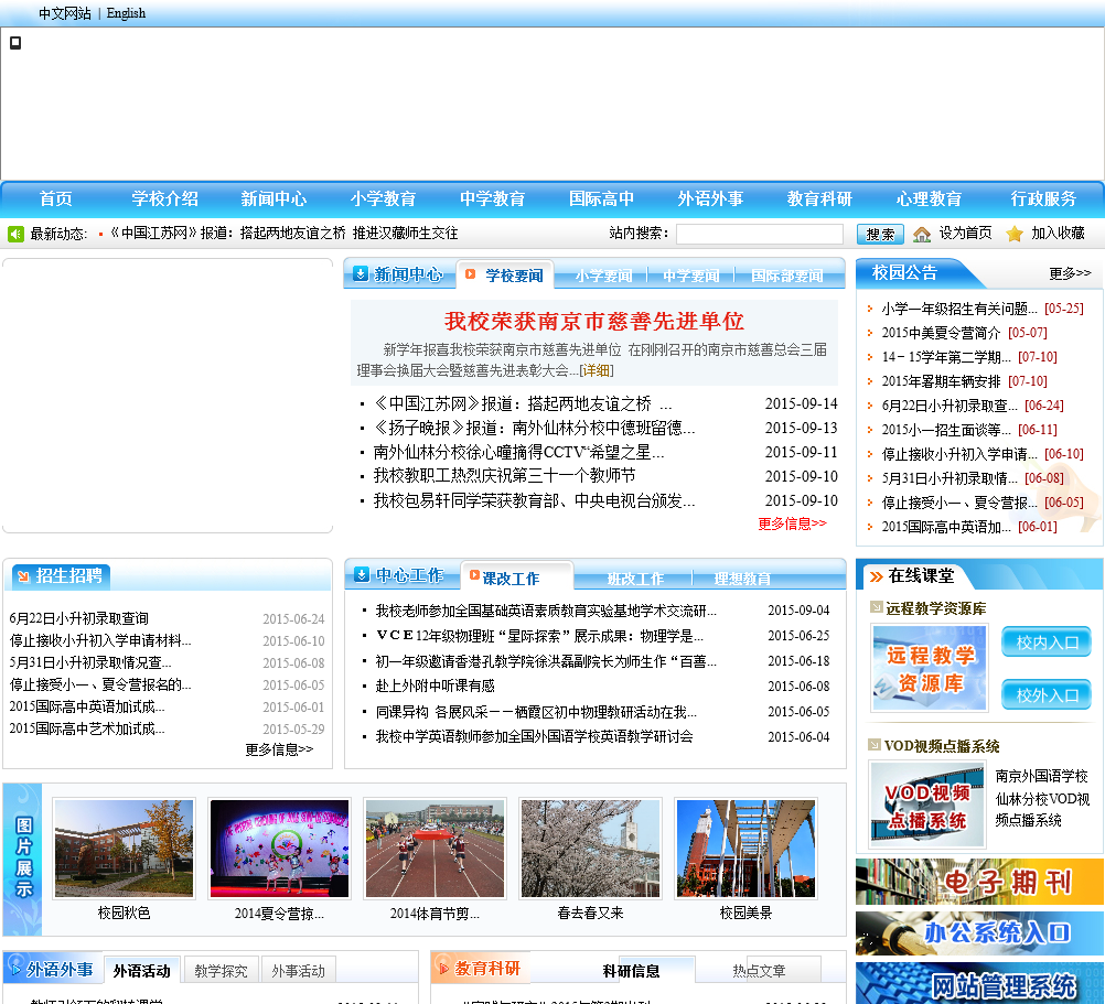 南京外国语学校仙林分校于2020-08-12被0702投稿网收录,网站相关信息来自互联网或网友分享!由于(南京外国语学校仙林分校)网站内容动态属性,时刻在变动,本站无法保证(南京外国语学校仙林分校)网站内容真实可靠!请大家查阅时,谨慎选择、自辩真伪,感谢您的理解与支持。如果您在访问(南京外国语学校仙林分校)时发现:网址失效、或网站存在非法等相关内容,请及时联系我们,我们会第一时间处理。