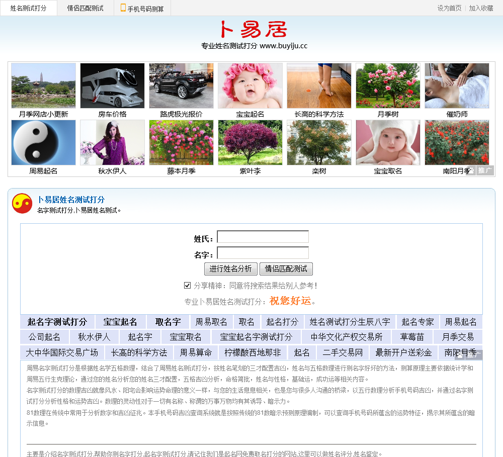 卜易居姓名测试打分于2020-08-13被0702投稿网收录,网站相关信息来自互联网或网友分享!由于(卜易居姓名测试打分)网站内容动态属性,时刻在变动,本站无法保证(卜易居姓名测试打分)网站内容真实可靠!请大家查阅时,谨慎选择、自辩真伪,感谢您的理解与支持。如果您在访问(卜易居姓名测试打分)时发现:网址失效、或网站存在非法等相关内容,请及时联系我们,我们会第一时间处理。