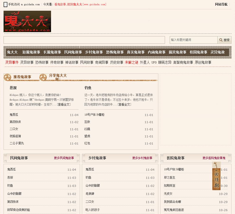 鬼大大鬼故事于2020-08-13被0702投稿网收录,网站相关信息来自互联网或网友分享!由于(鬼大大鬼故事)网站内容动态属性,时刻在变动,本站无法保证(鬼大大鬼故事)网站内容真实可靠!请大家查阅时,谨慎选择、自辩真伪,感谢您的理解与支持。如果您在访问(鬼大大鬼故事)时发现:网址失效、或网站存在非法等相关内容,请及时联系我们,我们会第一时间处理。