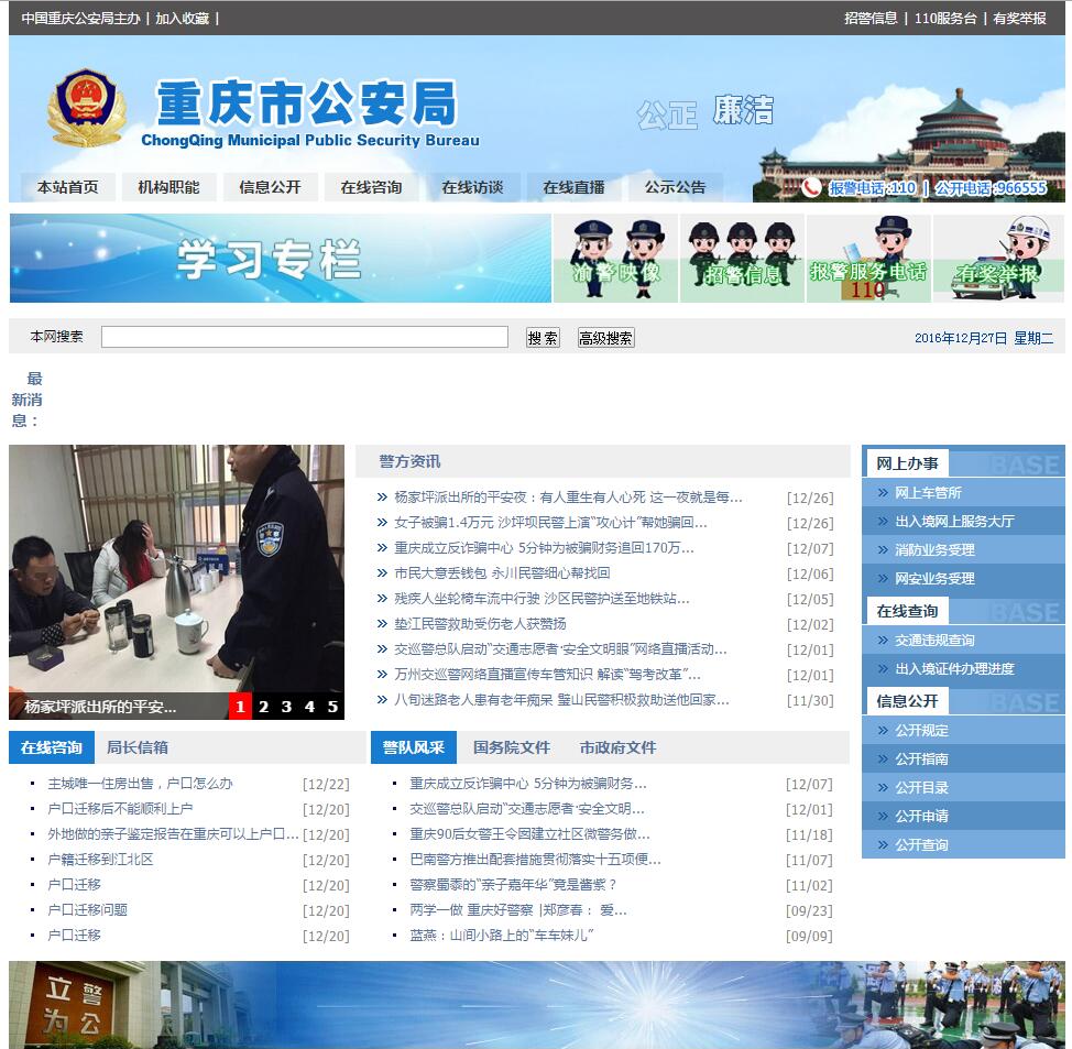 重庆市公安局公众信息网向公众提供警方资讯、公开政府信息,网上受理治安、消防、网监、车管等业务,并有交通违章、被盗车辆等信息的查询。