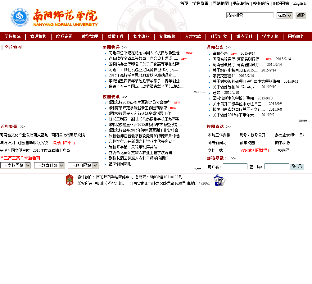 南阳师范学院于2020-08-14被0702投稿网收录,网站相关信息来自互联网或网友分享!由于(南阳师范学院)网站内容动态属性,时刻在变动,本站无法保证(南阳师范学院)网站内容真实可靠!请大家查阅时,谨慎选择、自辩真伪,感谢您的理解与支持。如果您在访问(南阳师范学院)时发现:网址失效、或网站存在非法等相关内容,请及时联系我们,我们会第一时间处理。