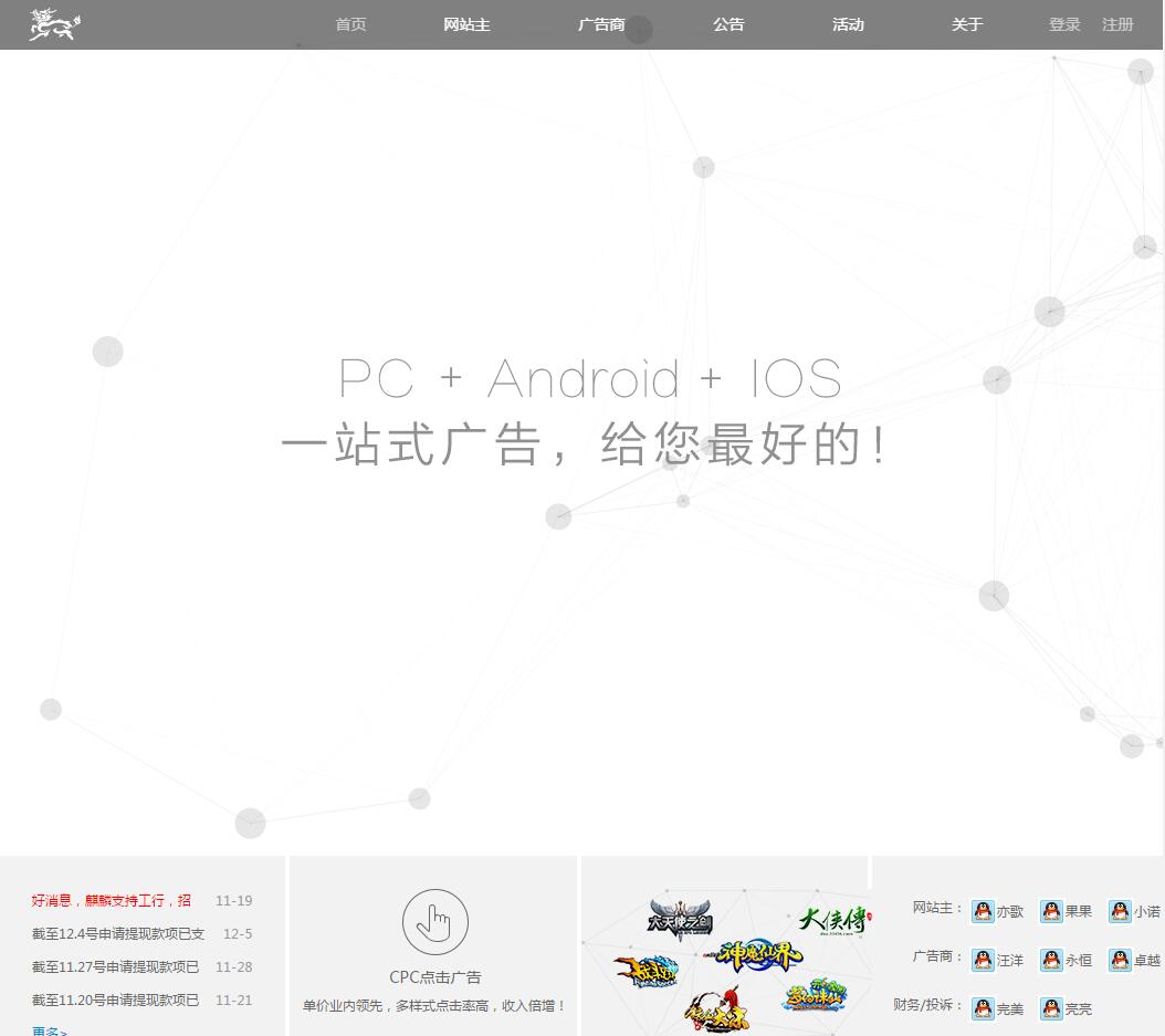 麒麟广告联盟于2020-08-14被0702投稿网收录,网站相关信息来自互联网或网友分享!由于(麒麟广告联盟)网站内容动态属性,时刻在变动,本站无法保证(麒麟广告联盟)网站内容真实可靠!请大家查阅时,谨慎选择、自辩真伪,感谢您的理解与支持。如果您在访问(麒麟广告联盟)时发现:网址失效、或网站存在非法等相关内容,请及时联系我们,我们会第一时间处理。