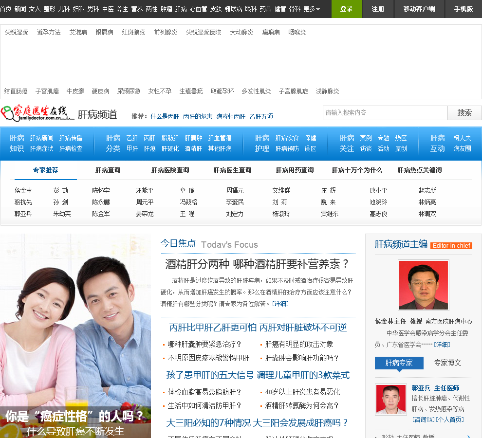 家庭医生在线(www.familydoctor.com.cn)肝病频道由中华医学会感染病学分会候任主任委员侯金林教授任主编,邀请业内知名专家讲解肝病的基础知识、治疗方法、肝病患者应该吃什么等信息,并着重推荐全国治疗肝病的知名医院,知名的肝病专家等。