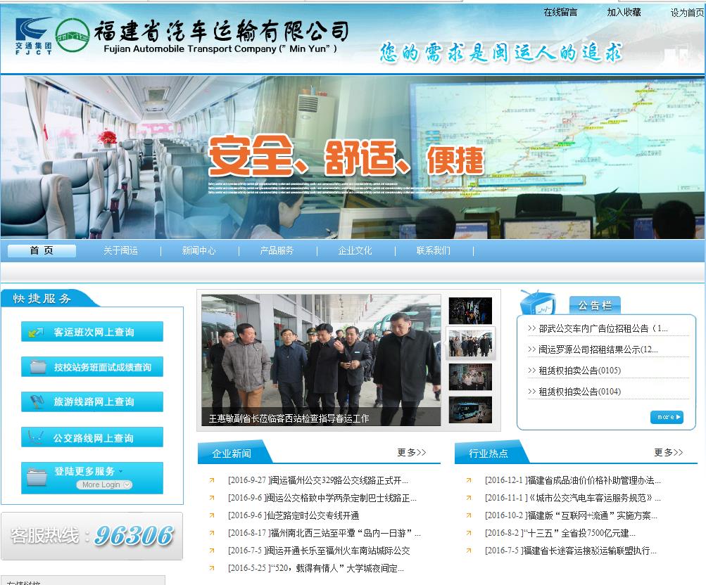 福建省汽车运输有限公司(简称“闽运”) ,隶属福建省交通运输集团有限责任公司,创建于1950年7月,主营道路客运、旅游客运、城市公共交通以及配套业务,现有直属分公司18家,全资子公司13家,控(参)股公司23家;等级客运站23个;一、二类修理厂13个,机动车检测线3条;营运车辆2200多辆。