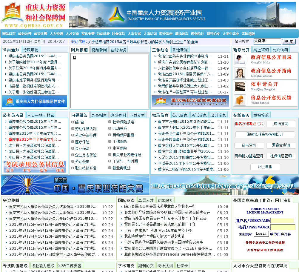 重庆劳动保障网为公众提供重庆地区职业技能培训信息发布,通过发布重庆地区的劳动市场招工企业信息,以及新的劳动求职者的在线求职信息,成为沟通求职者以及劳动力市场的桥梁。同时网站还发布新的国家医保,劳动局,人力资源以及社会保障等综合性新的政策以及法规。