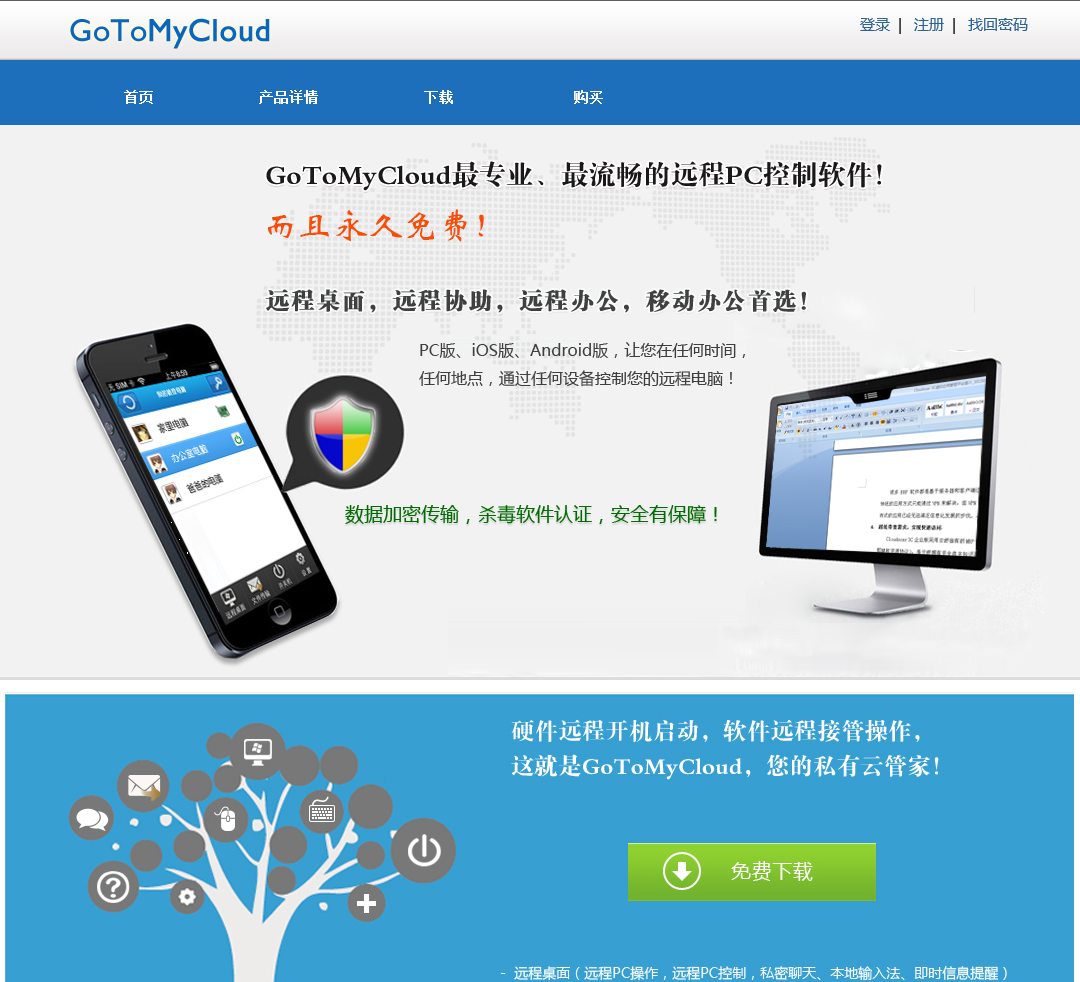 GoToMyCloud是一款完全免费的远程控制软件,只要用户安装GoToMyCloud软件,就能在世界上任何一台可以上网的电脑连接到被控电脑,进行远程桌面连接、远程控制、远程监控、远程协助等。还能通过安卓手机、安卓平板电脑、iphone、ipad控制电脑。GoToMyCloud结合CSK300云舒远程开关机卡,还能对远程电脑进行开机、关机...