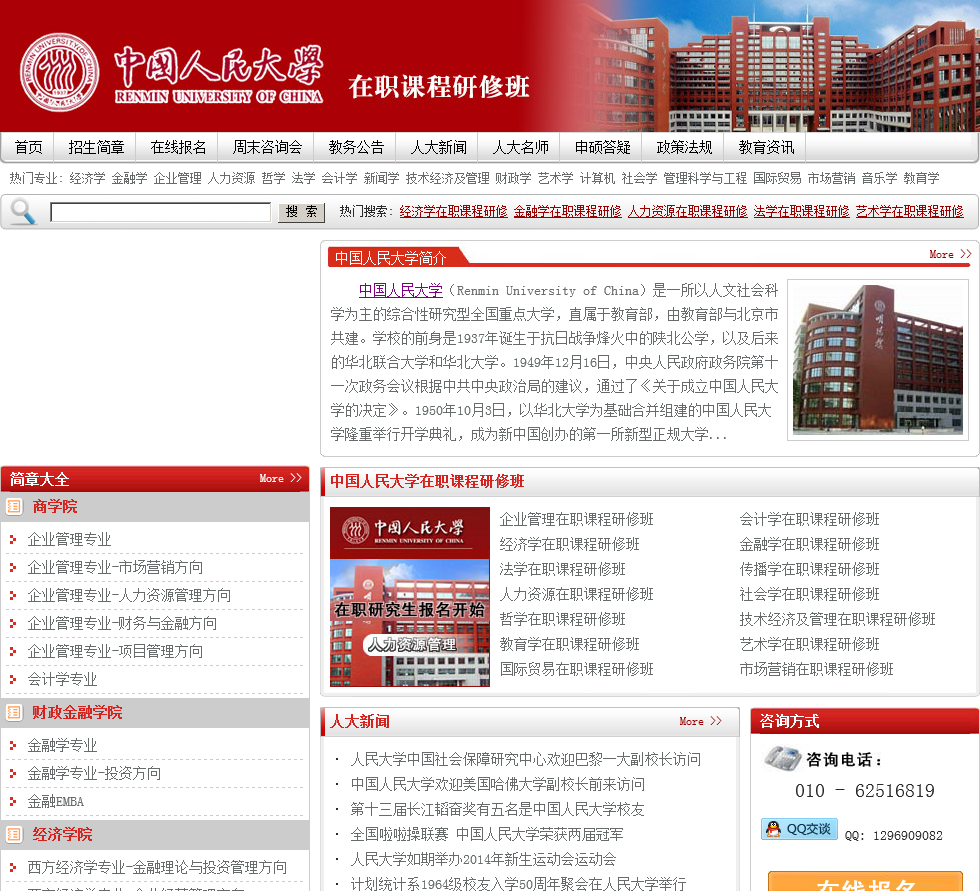 中国人民大学在职研究生网提供2015年新的人民大学在职研究生招生信息、招生简章、报考条件、学费等、人大在职研究生报名平台,可申请硕士学位,招生专业包括:人民大学经济学、金融学、新闻学、传播学、人力资源管理、法学、国际贸易、企业管理、心理学、社会学、项目管理等中国人民大学在职研究生招生专业。