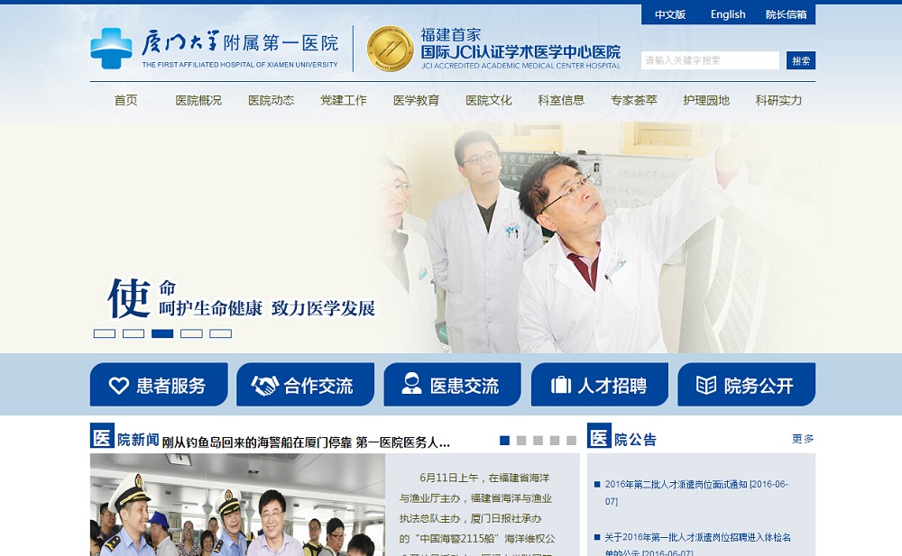 厦门大学附属第一医院于2020-08-23被0702投稿网收录,网站相关信息来自互联网或网友分享!由于(厦门大学附属第一医院)网站内容动态属性,时刻在变动,本站无法保证(厦门大学附属第一医院)网站内容真实可靠!请大家查阅时,谨慎选择、自辩真伪,感谢您的理解与支持。如果您在访问(厦门大学附属第一医院)时发现:网址失效、或网站存在非法等相关内容,请及时联系我们,我们会第一时间处理。