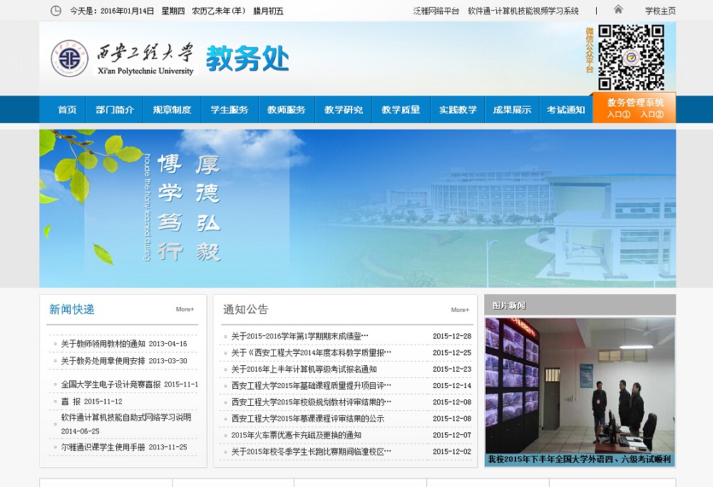 西安工程大学教务处于2020-08-23被0702投稿网收录,网站相关信息来自互联网或网友分享!由于(西安工程大学教务处)网站内容动态属性,时刻在变动,本站无法保证(西安工程大学教务处)网站内容真实可靠!请大家查阅时,谨慎选择、自辩真伪,感谢您的理解与支持。如果您在访问(西安工程大学教务处)时发现:网址失效、或网站存在非法等相关内容,请及时联系我们,我们会第一时间处理。