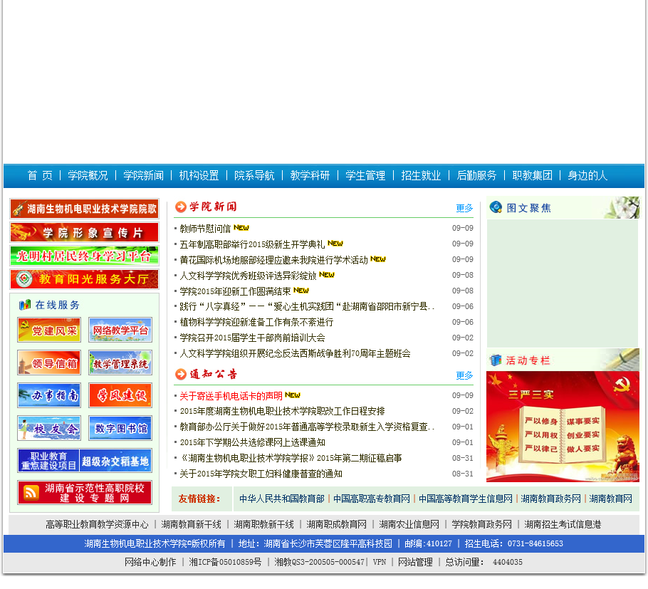 湖南生物机电职业技术学院于2020-08-31被0702投稿网收录,网站相关信息来自互联网或网友分享!由于(湖南生物机电职业技术学院)网站内容动态属性,时刻在变动,本站无法保证(湖南生物机电职业技术学院)网站内容真实可靠!请大家查阅时,谨慎选择、自辩真伪,感谢您的理解与支持。如果您在访问(湖南生物机电职业技术学院)时发现:网址失效、或网站存在非法等相关内容,请及时联系我们,我们会第一时间处理。
