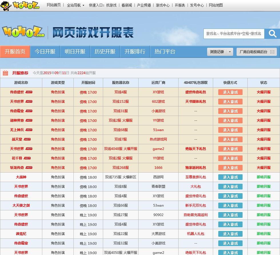 40407网页游戏开服表按照开服时间整理归纳当前各种热门网页游戏的开服信息,同时包含了各个网页游戏平台的开服信息,方便玩家选择查看。