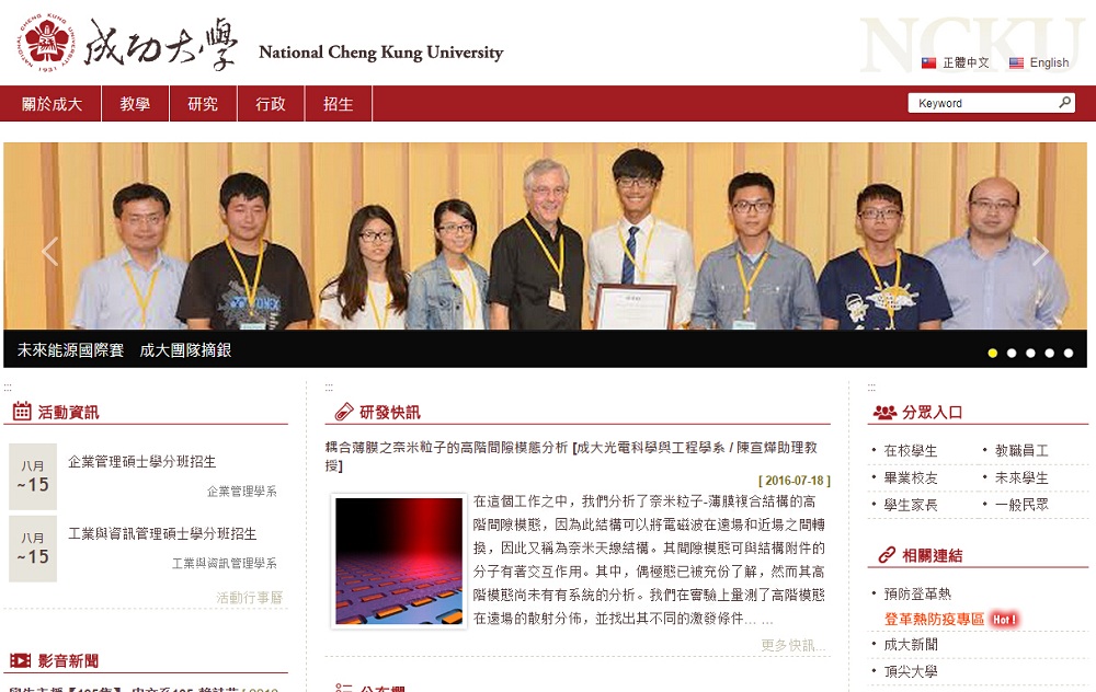 台湾成功大学于2020-09-16被0702投稿网收录,网站相关信息来自互联网或网友分享!由于(台湾成功大学)网站内容动态属性,时刻在变动,本站无法保证(台湾成功大学)网站内容真实可靠!请大家查阅时,谨慎选择、自辩真伪,感谢您的理解与支持。如果您在访问(台湾成功大学)时发现:网址失效、或网站存在非法等相关内容,请及时联系我们,我们会第一时间处理。